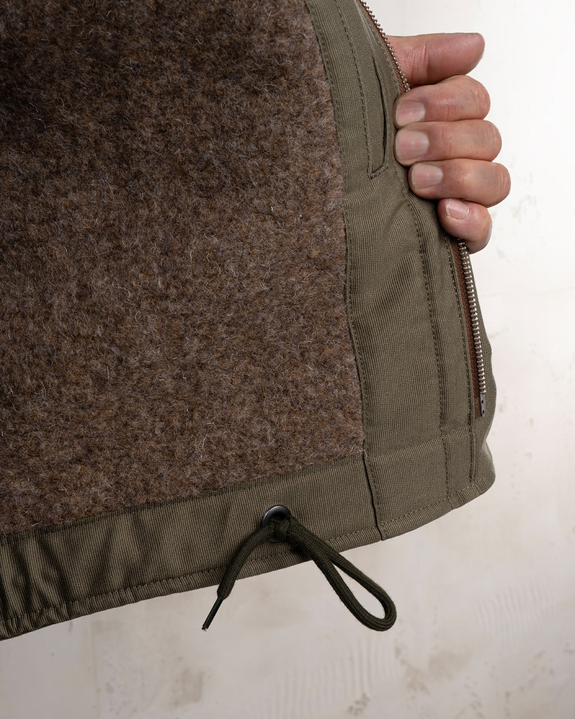 The general construction of the jacket combines a thick outer layer of "Jungle Cloth" with a wool lining. So the wearer stays warm and comfortable even under harshest weather conditions.