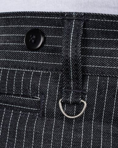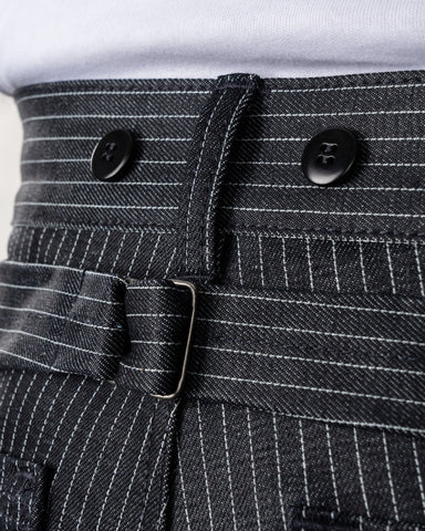 FRONT RISE: With the fly buttoned, we measure starting from the crotch seam to the top of the waistband following the fly, giving the front rise a slight pull to remove wrinkles and give a natural measurement.