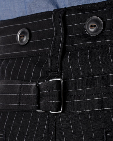 FRONT RISE: With the fly buttoned, we measure starting from the crotch seam to the top of the waistband following the fly, giving the front rise a slight pull to remove wrinkles and give a natural measurement.