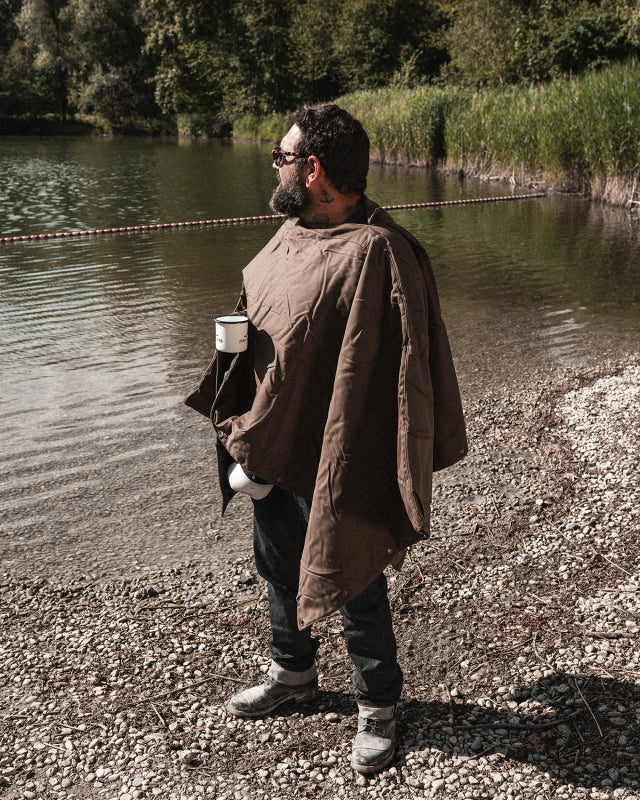 Made from waxed jungle cloth, the outside is water-repellent. The inside is lined with a padded wool blanket lining that is both warm and easy to care for.